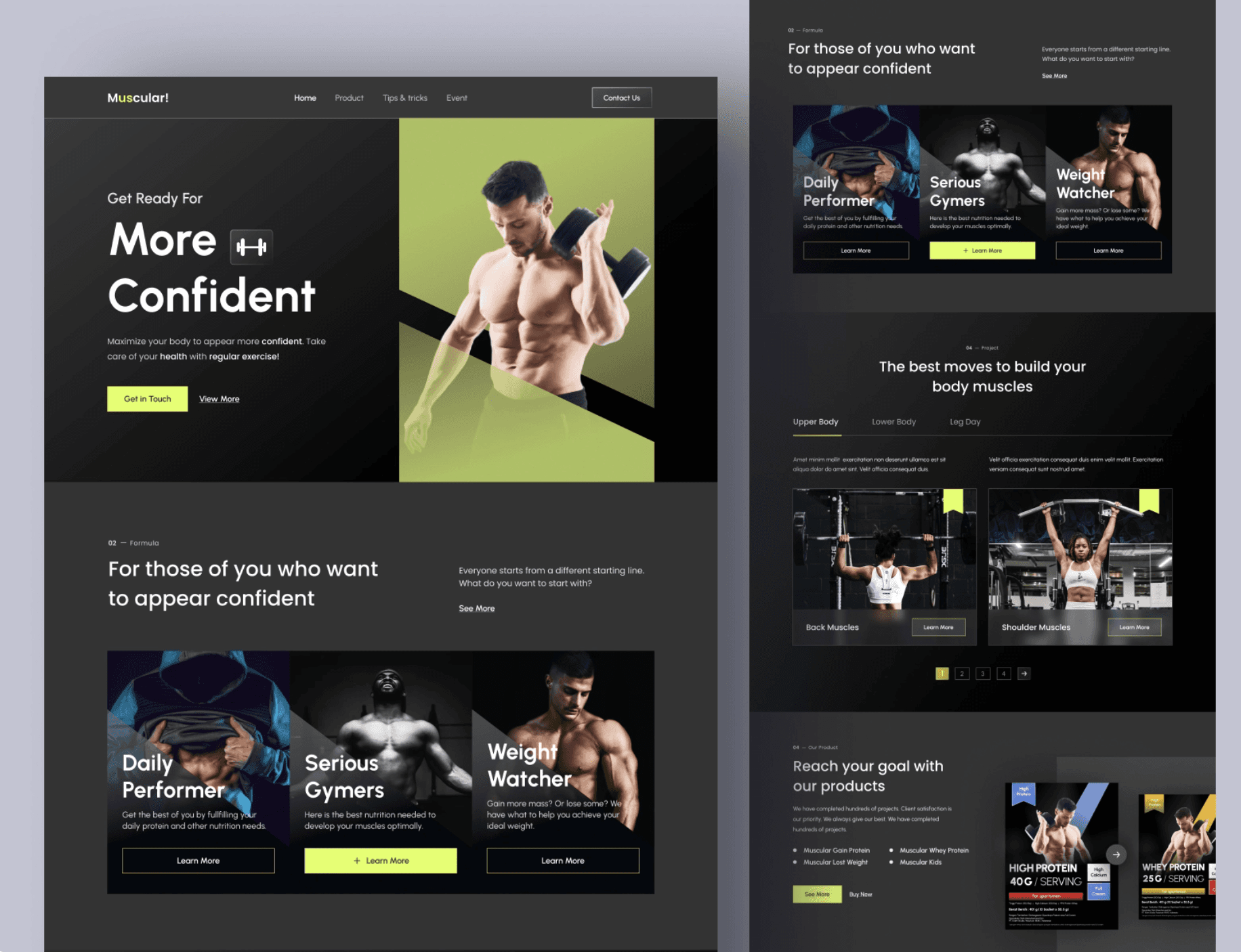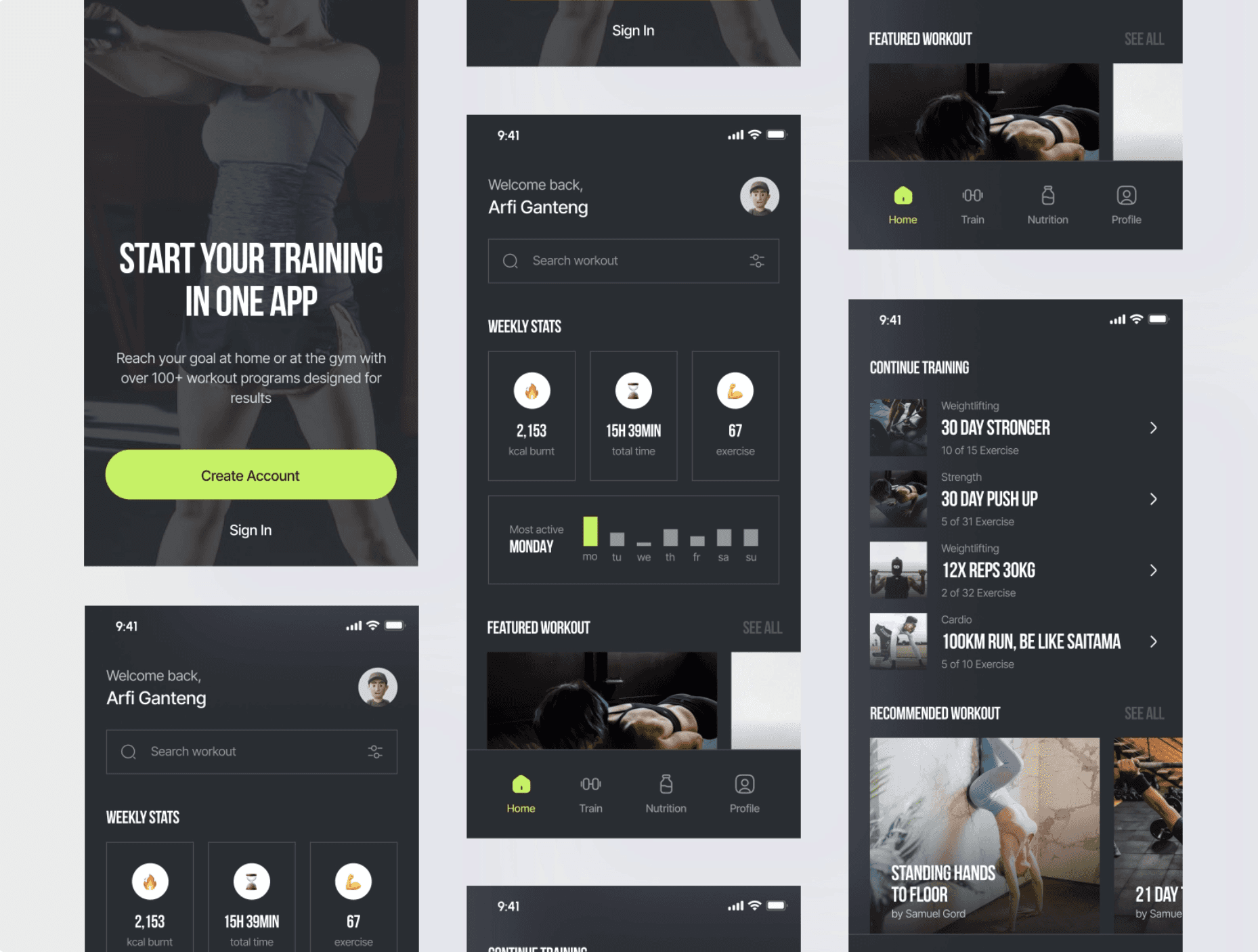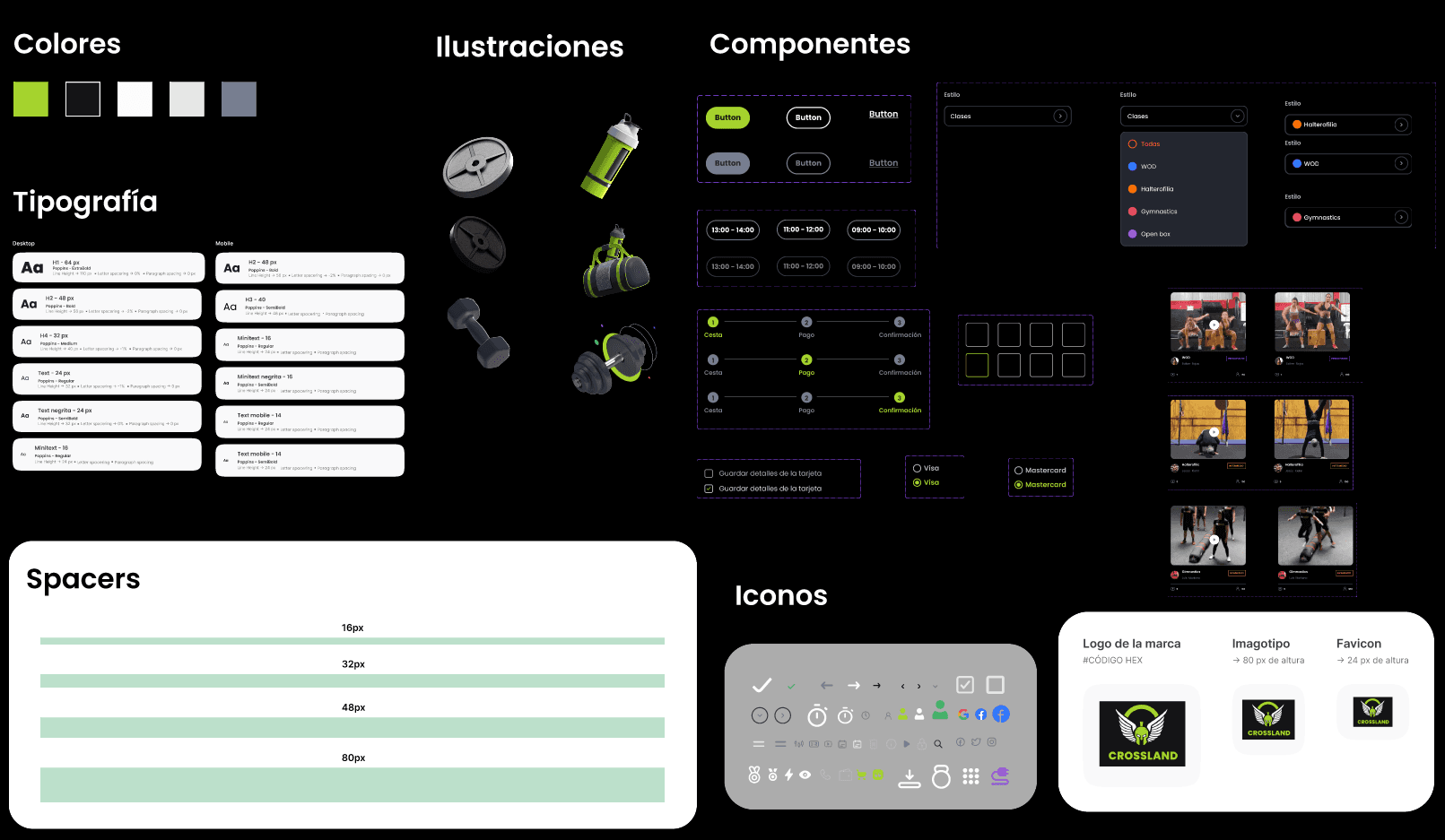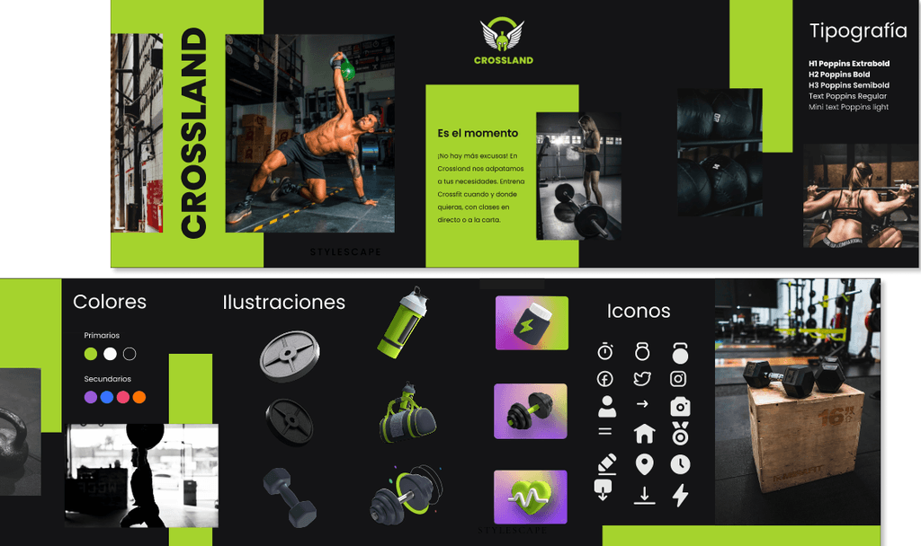 Realizamos dos Stylescapes que a través de la investigación nos decantamos por el modelo B con la tipografía Poppins, modo oscuro y con un verde más eléctrico dándole un toque en este caso energético.